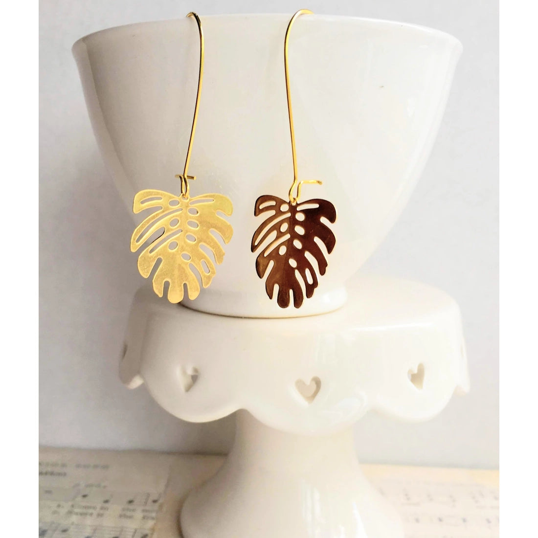 Beautiful botanical inspired golden brass monstera leaf earrings. These lovely tropical earrings feature golden brass monstera leaves hanging from gold plated brass ear wires. Each earring measures approximately 2 1/4 inches from top of the ear wire to the bottom of the leaves.