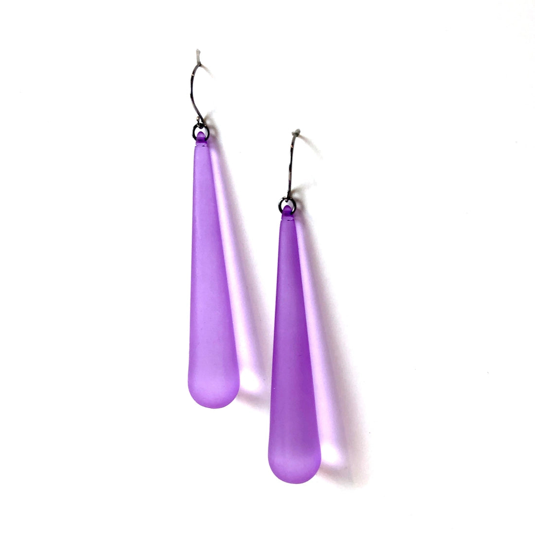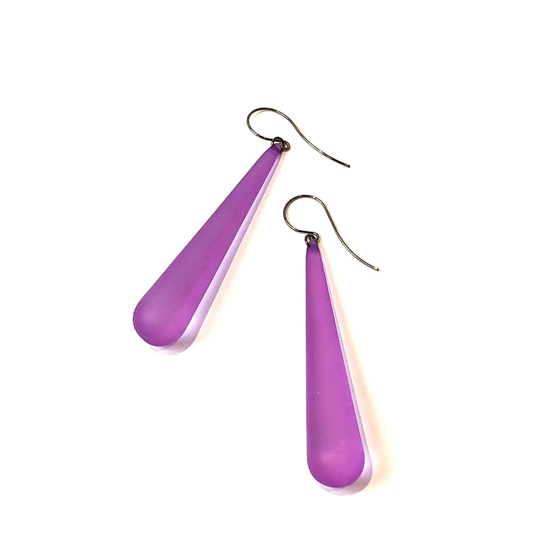 Lilac teardrop earrings in a sleek & elongated style & a frosted finish. These statement earrings feature either vintage or made-with-vintage moulds lucite drops. Each measures just about 3.25" or 85mm in length & 14mm in diameter in width at the widest part or the base of the drop. Earwires are silver plated metal, frosted 24k gold plated or gun metal & are hypo allergenic. (Gun Metal is shown in pics)