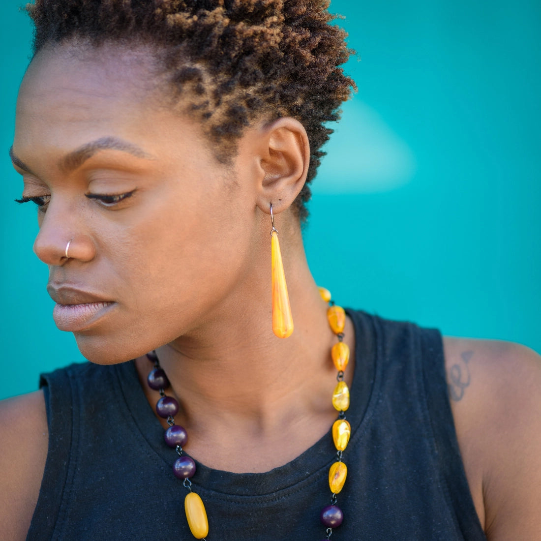 Light-weight & fun to wear. Most all earrings are made with vintage lucite parts that were made in Rhode Island in the 1960's - early 80's by Best Plastics. We hand-set them with surgical steel earring posts and they have sturdy surgical steel/acrylic backings on them as well.