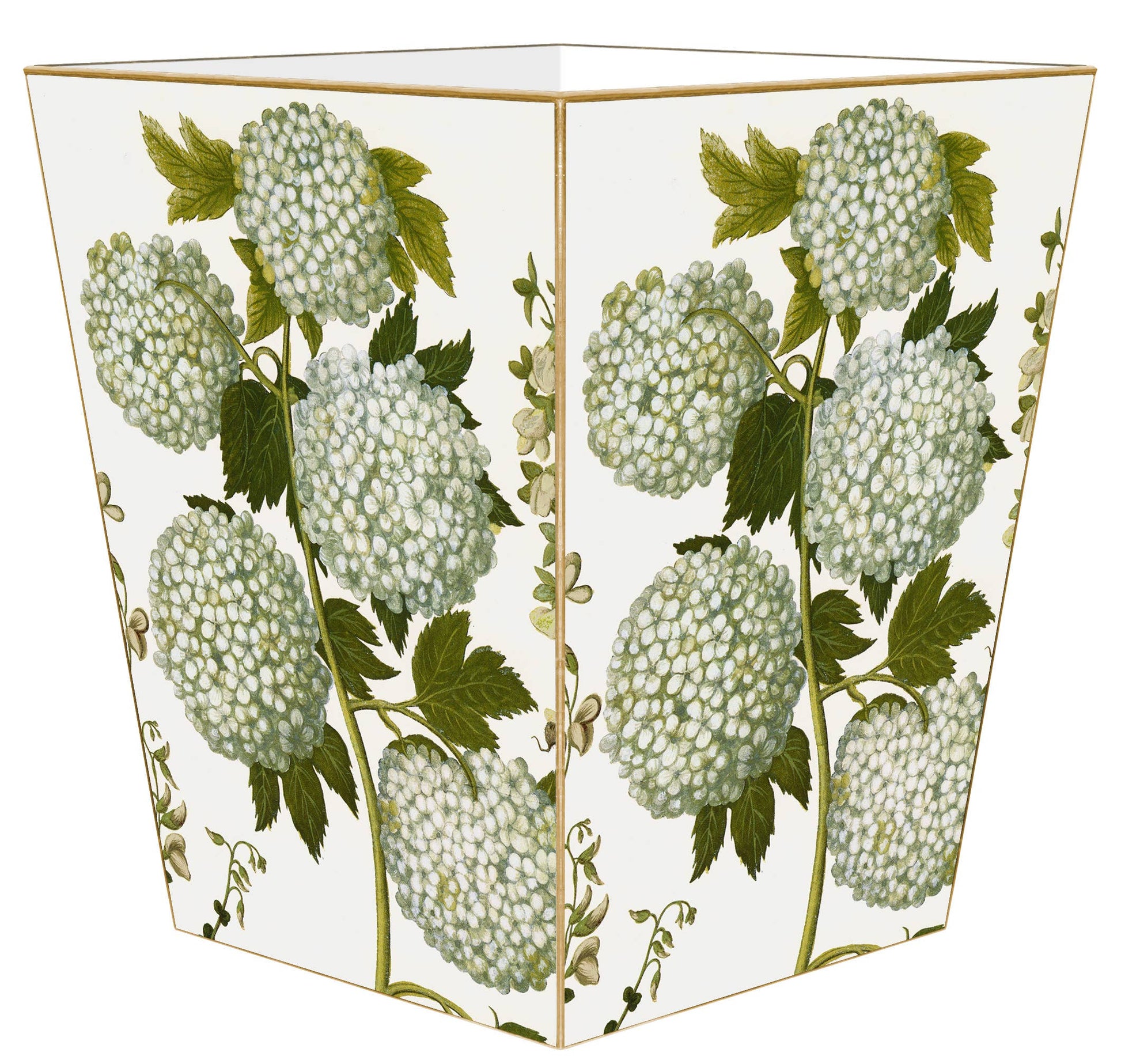 Our wastepaper baskets are handmade to order by our team in Houston, Texas. The wastepaper basket is made of wood. The artwork is hand-cut, decoupaged, and polished by our small team of artisans. Each wastepaper basket is carefully painted gold or silver around the edges as the perfect finishing touch.